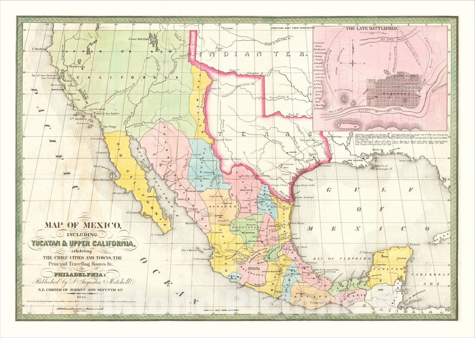 Historic Map : Map of Mexico, Including Yucatan and Upper California, exhibiting The Chief Cities And Towns, The Principal Travelling Routes, 1846, 1846, v1, Vintage Wall Art