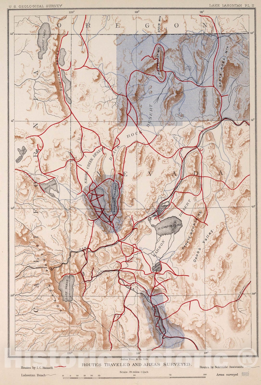 • Historic Map : Plate II: Routes traveled and areas surveyed, 1885, Vintage Wall Art