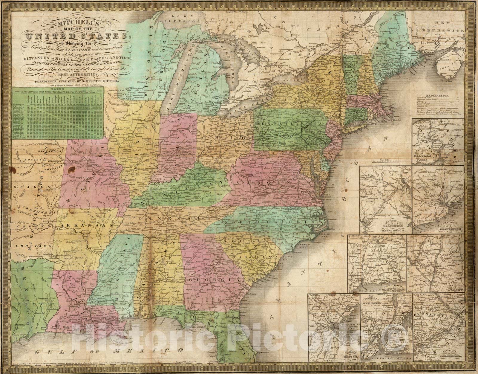 Mitchell's Map Of The United States Showing the Principal Travelling, Turnpike and Common Roads ... Philadelphia: Published By S. Augustus Mitchell. 1838. Sold by Mitchell & Hinman. No. 6 North Fifth Street. Entered ... 1835, by S. Augustus Mitchell... Pennsylvania. (with 8 inset maps. (with) Mitchell's Compendium Of The Internal Improvements Of The United States; Comprising General Notices Of All The Most Important Canals and Rail-Roads... Philadelphia: Published By Mitchell & Hinman, No. 6, North-Fifth Street. 1838. (on verso) Entered ... 1835, by Mitchell & Hinman ... Pennsylvania. Stereotyped by John Fagan ... Philadelphia. | Mitchell's Compendium Of The Internal Improvements Of The United States; Comprising General Notices Of All The Most Important Canals and Rail-Roads... Philadelphia: Published By Mitchell & Hinman, No. 6, North-Fifth Street. 1838. (on verso) Entered ... 1835, by Mitchell & Hinman ... Pennsylvania. Stereotyped by John Fagan ... Philadelphia. (with) Mitchell's Map Of The United States Showing the Principal Travelling, Turnpike and Common Roads ... Philadelphia: Published By S. Augustus Mitchell. 1838. Sold by Mitchell & Hinman. No. 6 North Fifth Street. Entered ... 1835, by S. Augustus Mitchell... Pennsylvania. (with 8 inset maps). | See note field above.