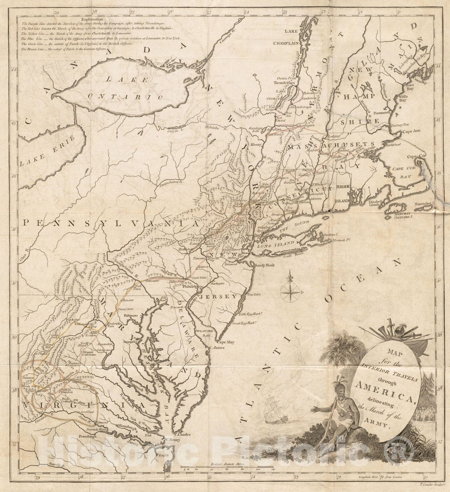 • .Historical Map, 1789 Map for The Interior Travels Through America : delineating The March of The Army, Vintage Wall Art
