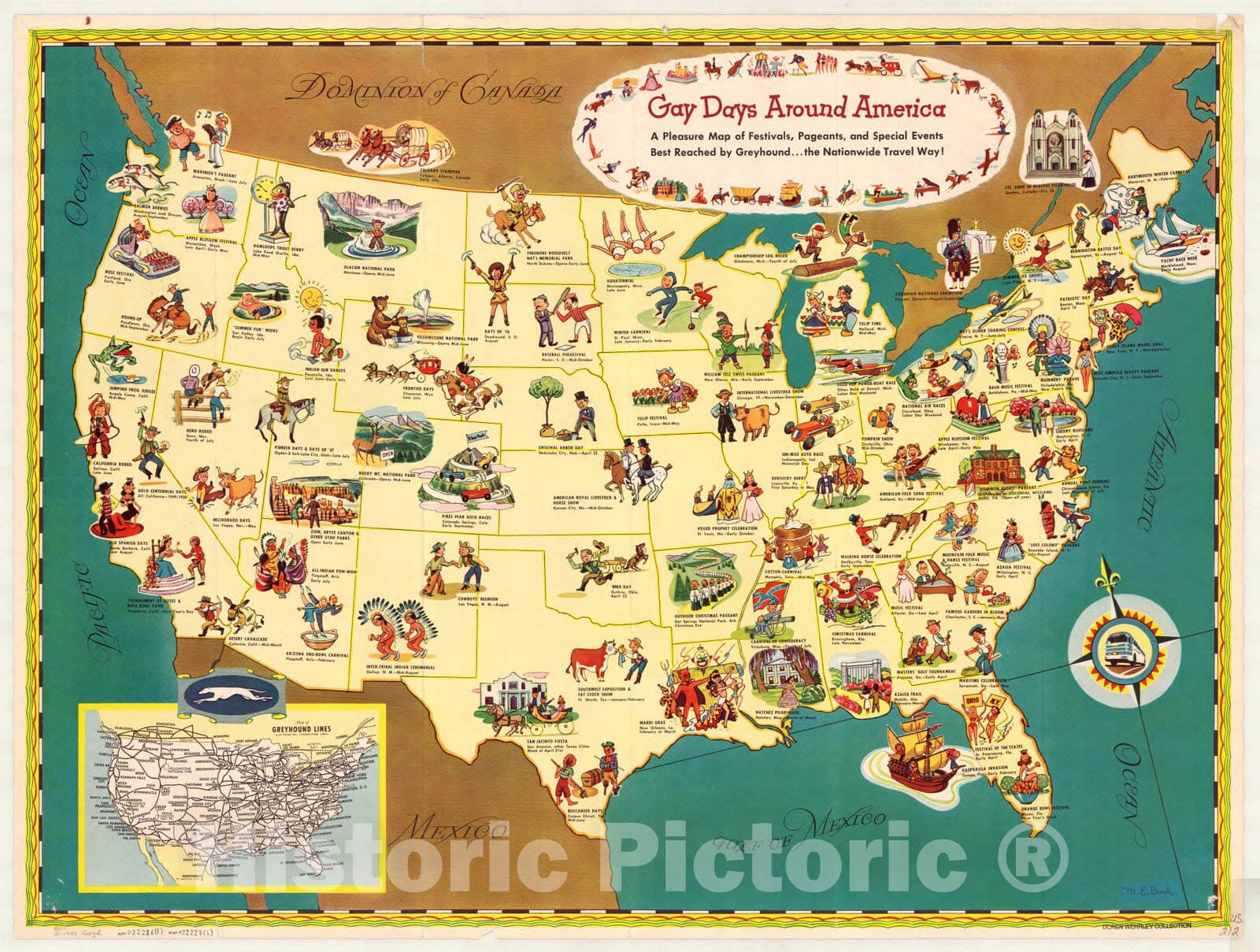 Map : United States 1949, America celebrates : a travel map of festivals, pageants and special events best reached by ... Greyhound , Antique Vintage Reproduction