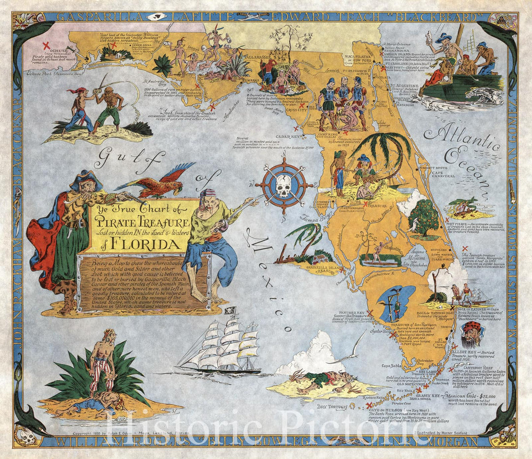 Historic Map : Ye True Chart of Pirate Treasure Lost or Hidden in the Land and Waters of Florida, 1950, Warner Sanford, Vintage Wall Art