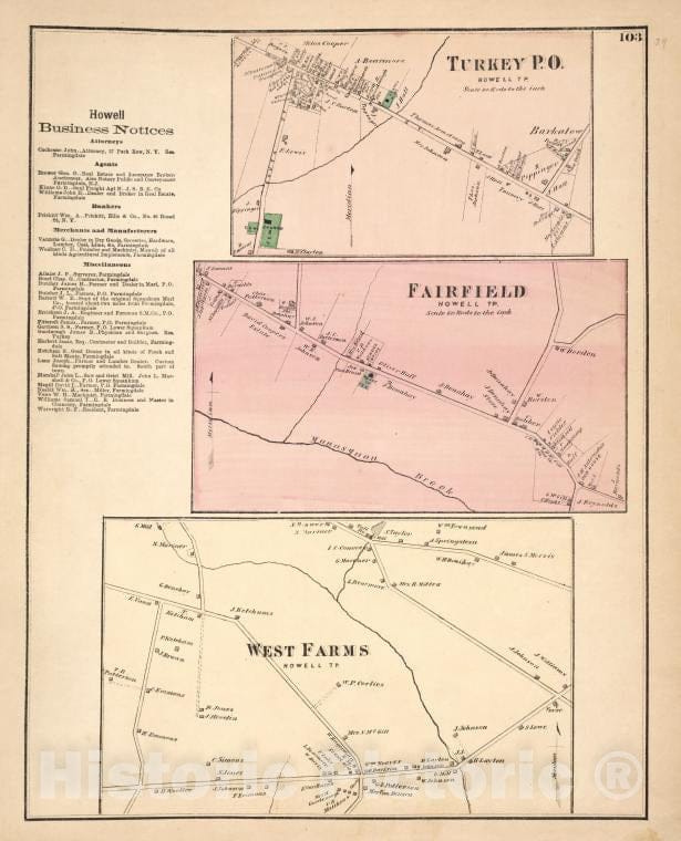 Historic 1873 Map - Howell Business Notices; Turkey P.O. [Village]; Fairfield [Vil