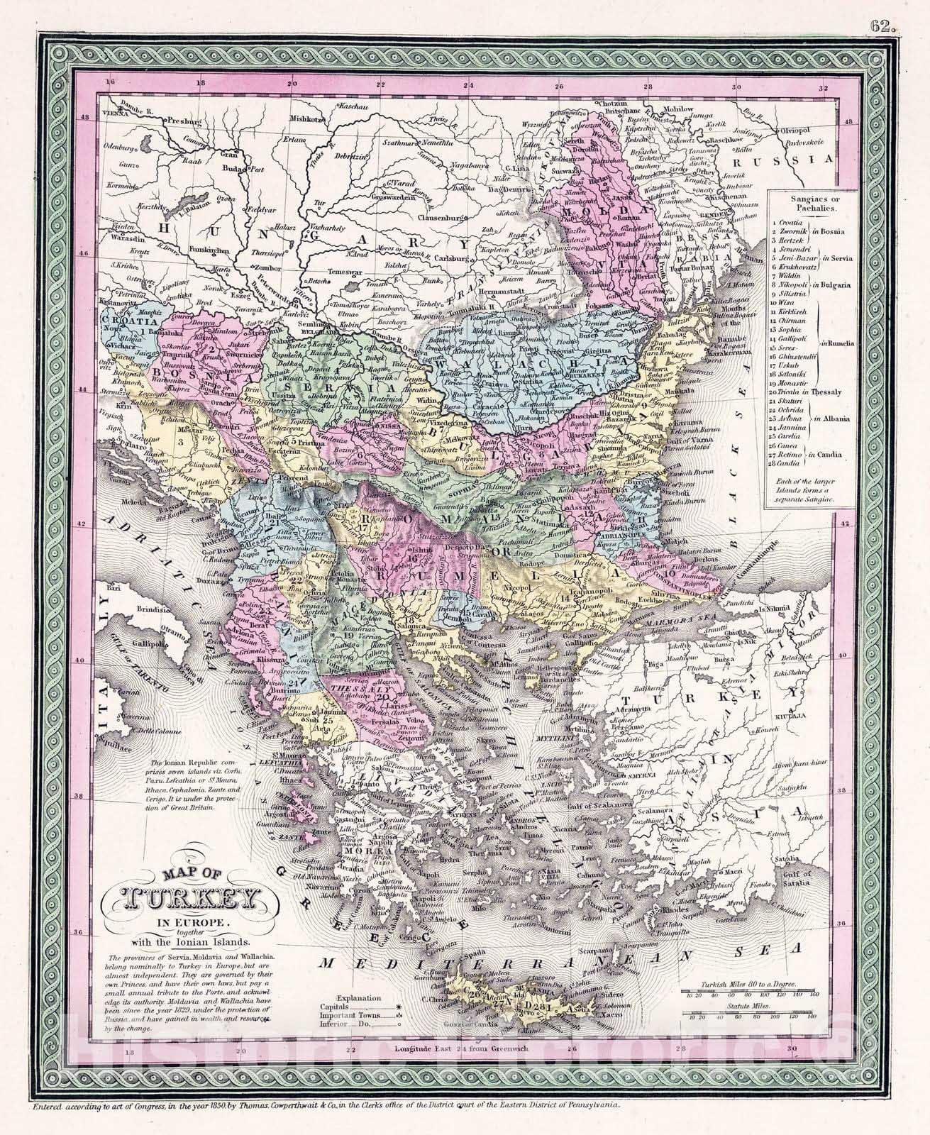 Historic Map : 1853 Turkey in Europe. Together with Ionian Islands - Vintage Wall Art