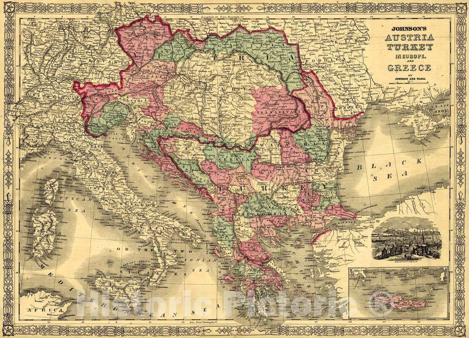 Vintage Map | 1864 Johnson's Austria, Turkey in Europe and Greece | Johnson and Ward