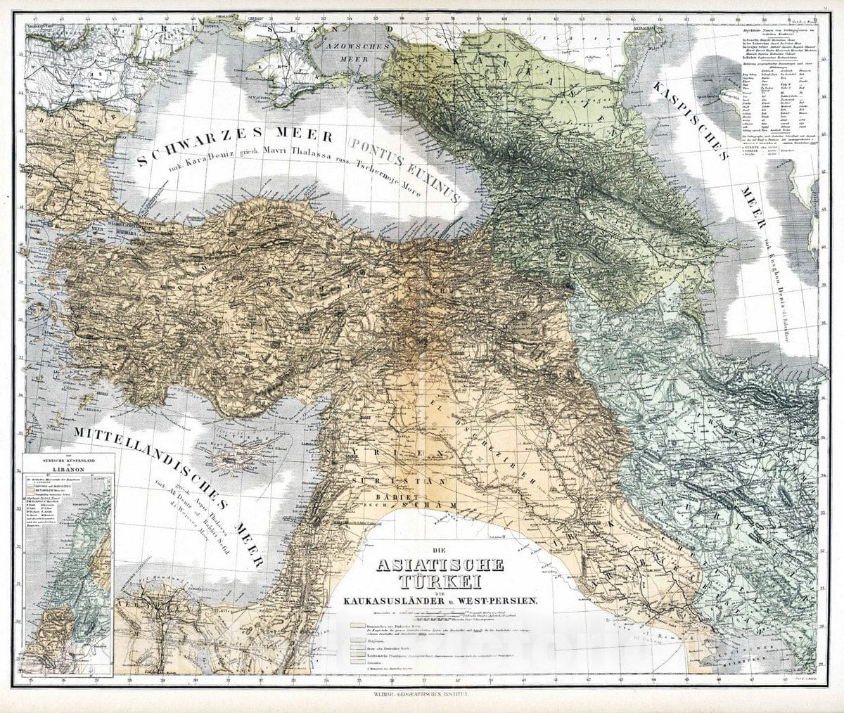 Historic Map : 1886 Turkey in Asia, Syria, Lebanon, Iraq, Iran, Azerbaijan, Armenia, Georgia. - Vintage Wall Art