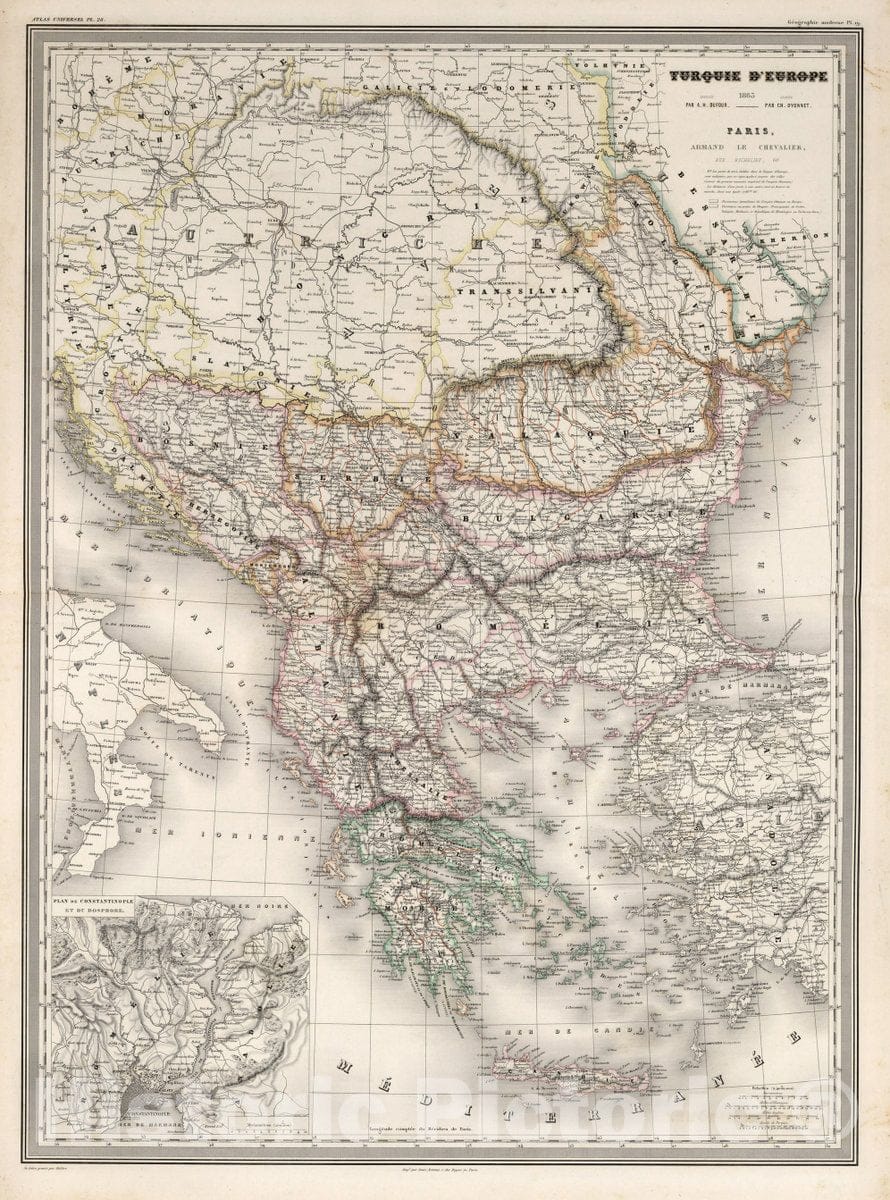 Turquie d'Europe 1863 : Dresse par A.H. Dufour. Gravee par Ch. Dyonnet. Paris, Armand Le Chevalier, Rue Richelieu, 60. La Lettre gravee par Deletre. Impe. par Louis Antonie, r. des Noyers 70, Paris. (inset) Plan de Constantinoplenet de Bosphore. (to accompany) Atlas Universel, Physique, Historique Et Politique De Geographie Ancienne Et Moderne. Pl. 28. (on upper margin) Geographie moderne. Pl. 19. | Atlas Universel, Physique, Historique Et Politique De Geographie Ancienne Et Moderne. Compose Et Dresse Par H. Dufour. Grave Sur Acier Par Ch. Dyonnet ... Paris, Armand Le Chevalier, Editeur, Rue Richelieu, 60. (green paste down label) L'introduction de cet ouvrage dans les etablissements d'Instruction publique est autorisee par decision de s. Exc. M. Le Ministre De L'Instruction Publique, en date du 8 decembre 1863. | Publisher:Armand Le Chevalier