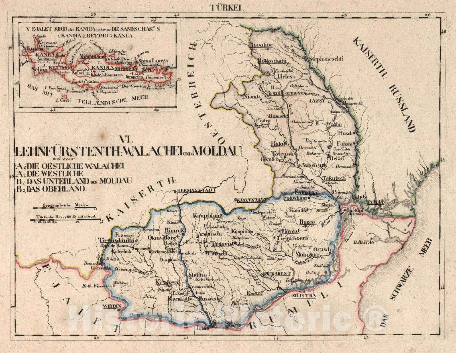 Historic Map : Turkey, Ottoman Empire V.1:1-5: II: Turkei. VI. Lehnfurstenth: Walachei und Moldau. Ejalet Kirid order Kandia 1825 , Vintage Wall Art