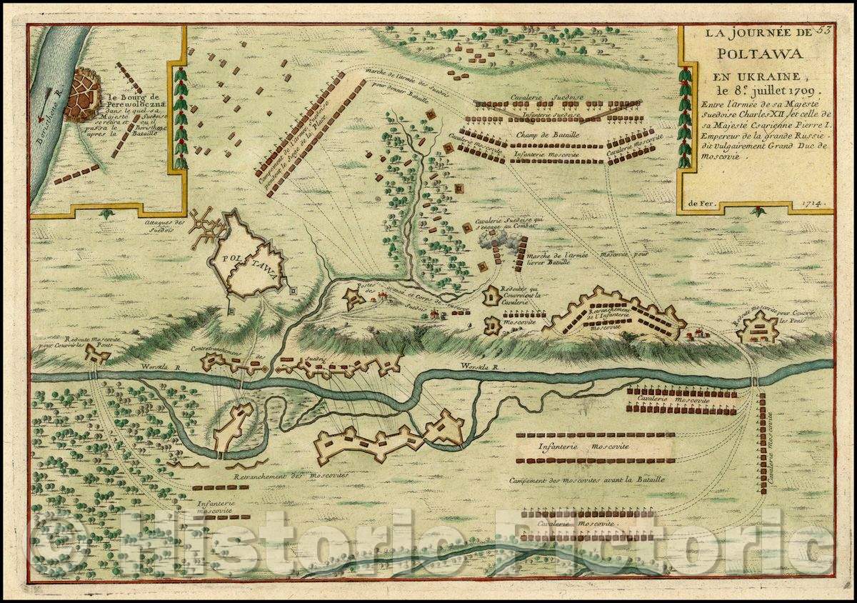 Historic Map - La Journee De Poltawa En Ukraine le 8e. julliet 1709; Entre l'Armee de sa Majeste Suedoise Charles XII/Plan of the Battle of Poltava, 1714 - Vintage Wall Art
