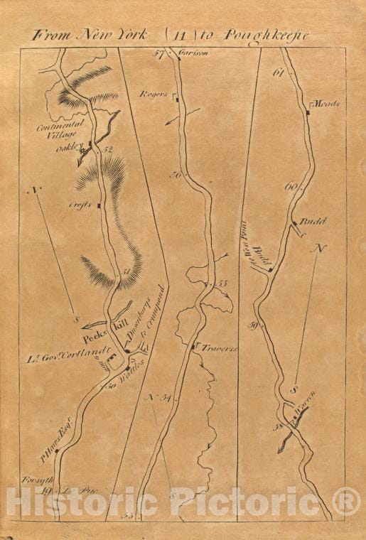 • .Historic 1789 Map - From New York (11) To Poughkeepsie. - Middle Atlantic States - United States - A Survey Of The Roads Of The United States Of America - Vintage Wall Art