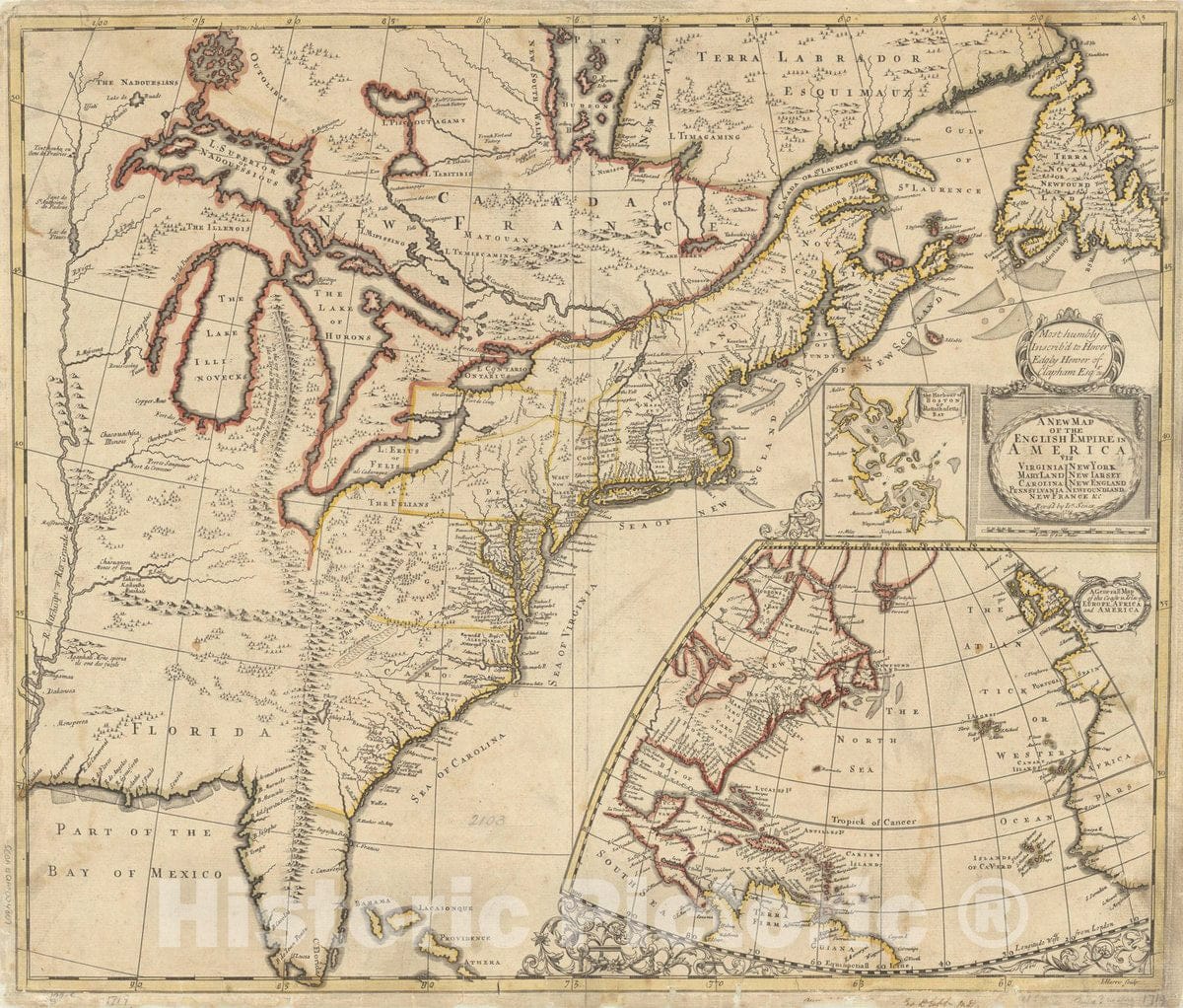 A new map of the English empire in America viz Virginia, New York, Maryland, New Jersey, Carolina, New England, Pennsylvania, New Foundland, New France & c / revis'd by Ion Senex ; I. Harris, sculp.