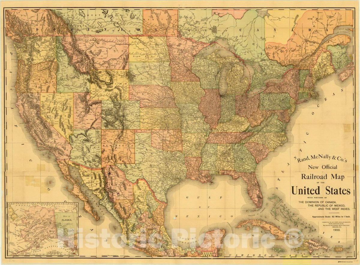 Map : United States 1900, Rand McNally & Co.'s new official railroad map of the United States with portions of the Dominion of Canada, Antique Vintage Reproduction