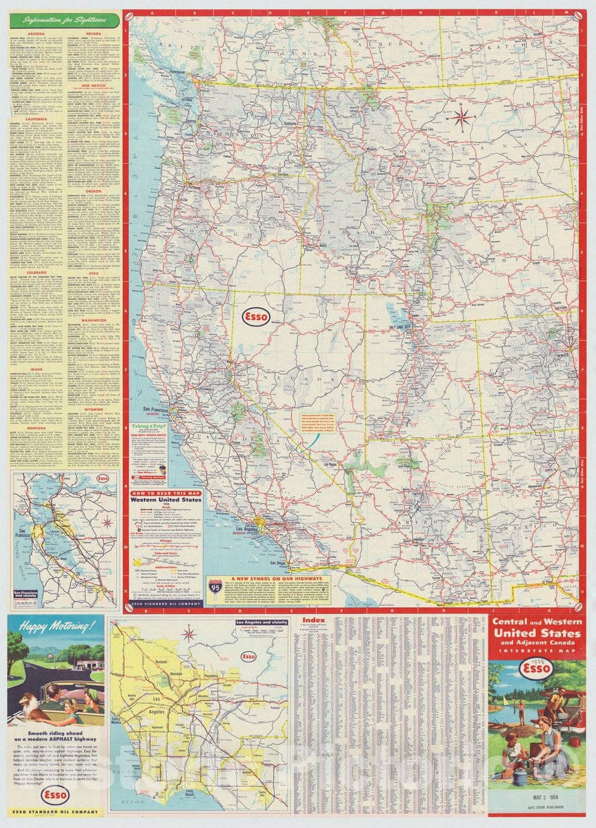 Map : United States 1958 2, Central and western United States and adjacent Canada interstate map, Antique Vintage Reproduction