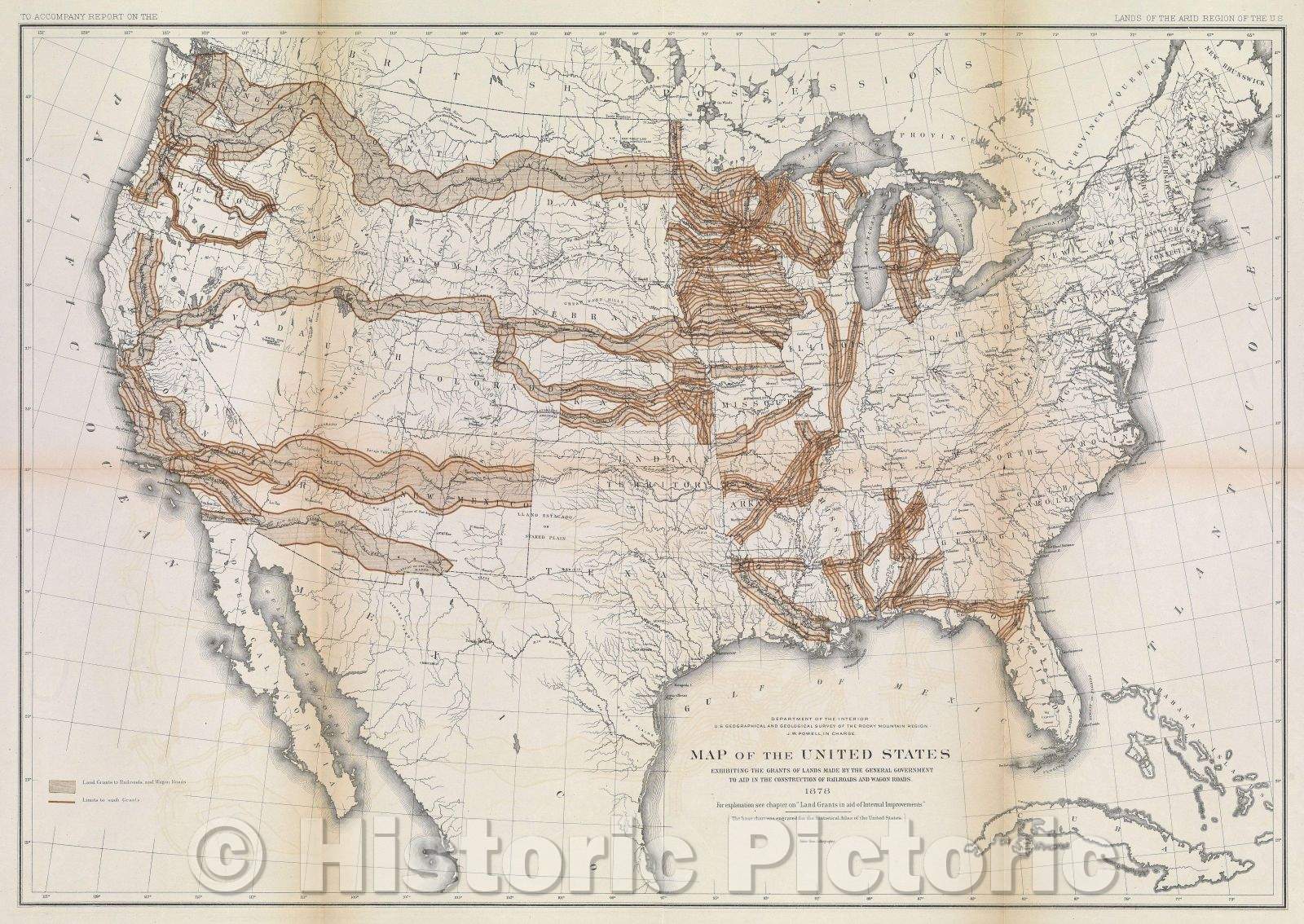 Historic Map : Map of the United States Exhibiting the Grants of Land Made by the General Government to Aid in the Construction of Railroads and Wagon Roads. 1878., 1878 , Vintage Wall Art