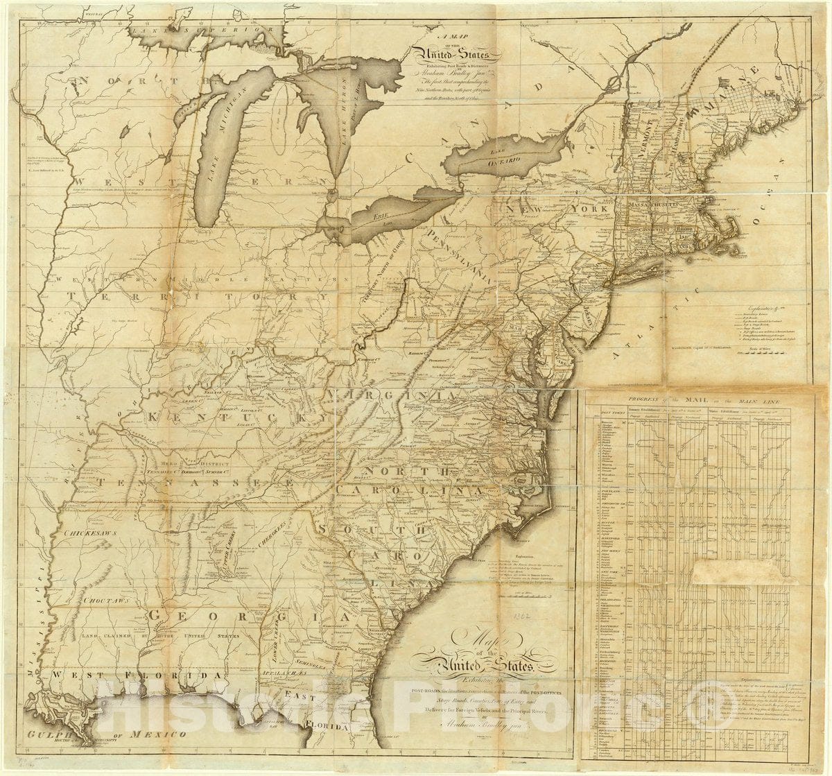 A map of the United States exhibiting post roads & distances : the first sheet comprehending the nine northern states, with parts of Virginia and the territory north of Ohio / by Abraham Bradley Junr. ; W. Harrison Junr., sc.