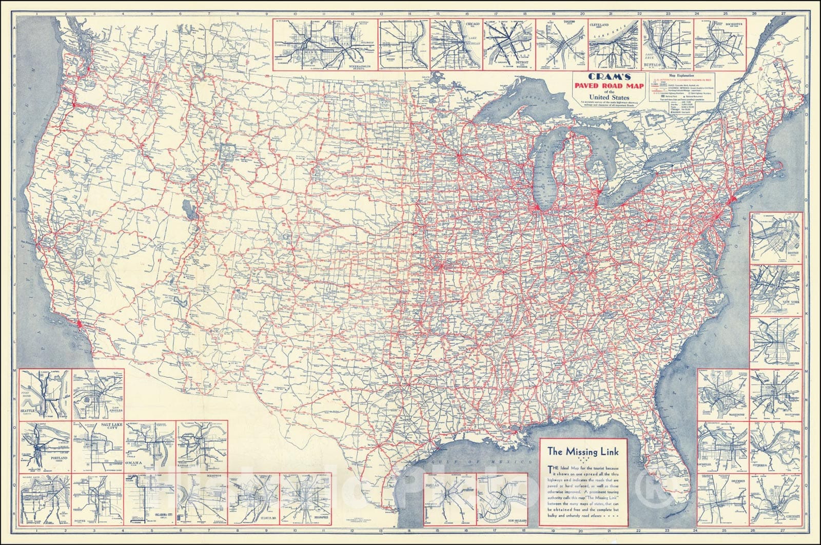 Historic Map : Cram's Paved Road United StatesAn accurate survey of the main highways showing mileage and character of all important Roads, 1930, Vintage Wall Art