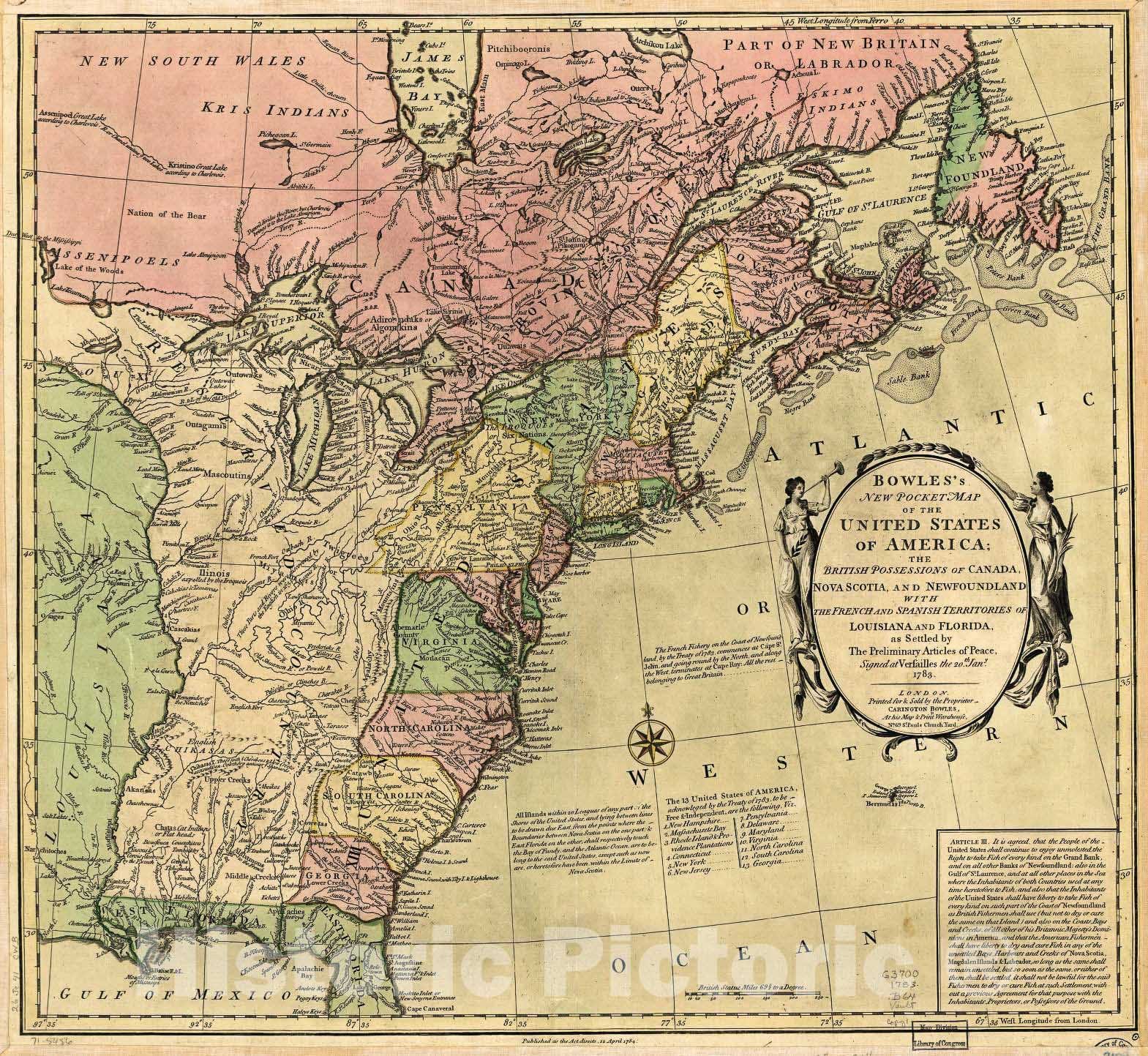 Bowles's new pocket map of the United States of America; the British possessions of Canada, Nova Scotia, and Newfoundland, with the French and Spanish territories of Louisiana and Florida, as settled by the preliminary articles of peace signed at Versa