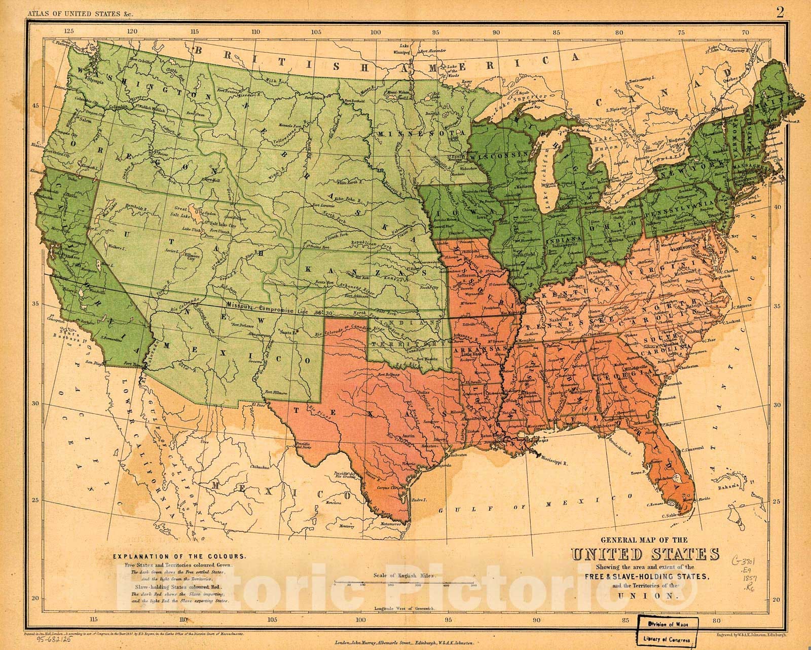 Historic 1857 Map - General map of The United States, Showing The Area and Extent of The Free & Slave-Holding States, and The Territories of The Union