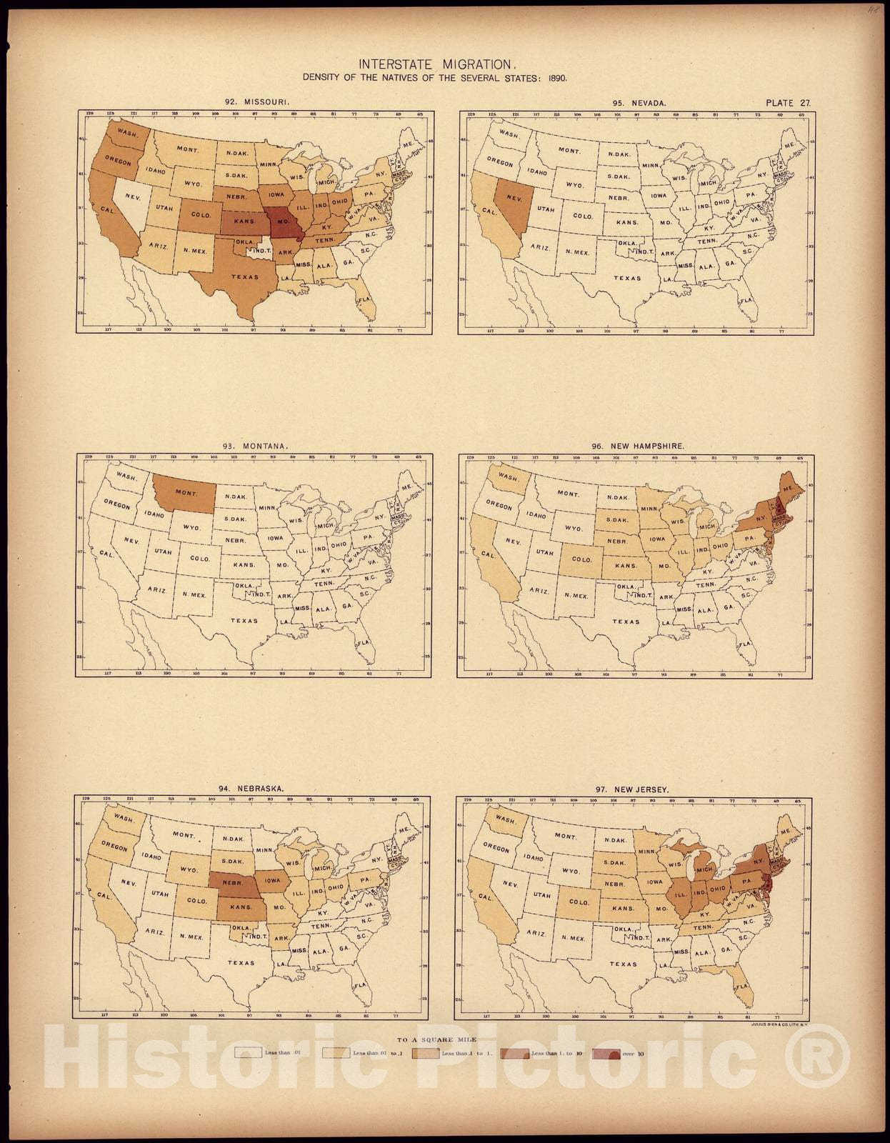 Historic 1898 Map - Statistical Atlas of The United States, Based Upon The Results of The Eleventh Census - Interstate Migration : 1890 (in, Indian Territory, IA, KS, KT, LA)
