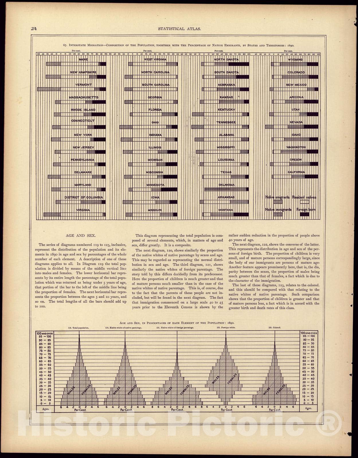 Historic 1898 Map - Statistical Atlas of The United States - Interstate Migration (Continued); Age and Sex, in Percentage of Each Element of The Population: 1890