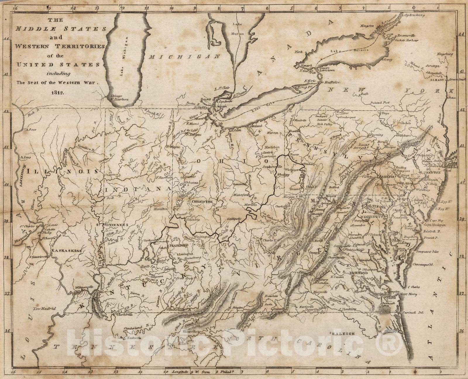Historic Map : 1816 Middle States and Western Territories of the United States, Including The Seat of the Western War. 1812 - Vintage Wall Art