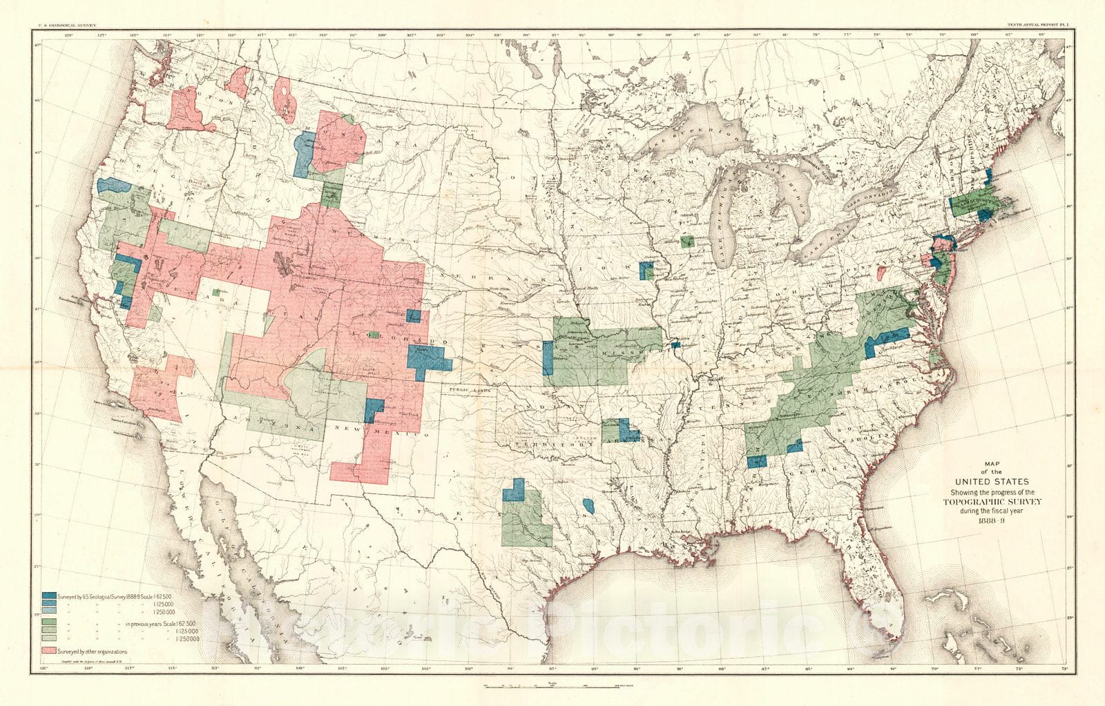 Historic Map : 1889 Map of the United States Showing the Progress of Topographic Survey the Fiscal Year 1888-89 : Vintage Wall Art