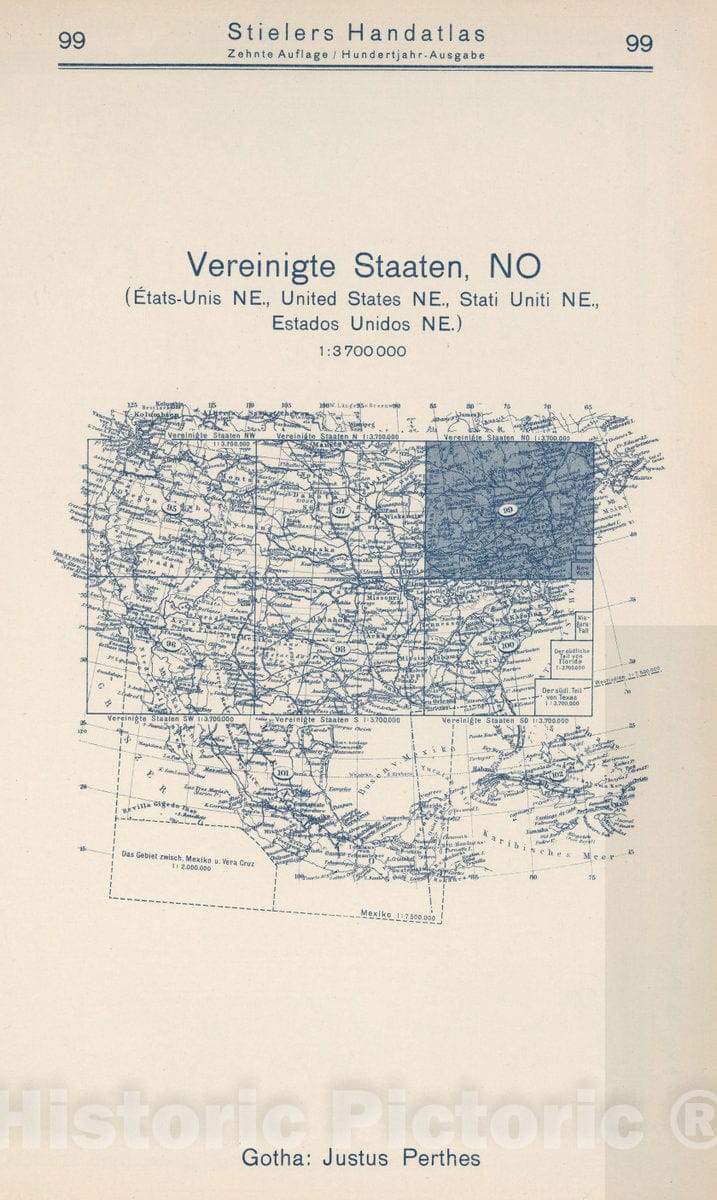 (Index Map) 99. Vereinigte Staaten NO. United States NE. | Stieler's Atlas of Modern Geography. 254 Maps & Insets on 108 Sheets Engraved on Copper. Tenth (Centenary) Edition. Completely Revised & Largely Redrawn under the Direction of Professor H. Haack in Justus Perthes' Geogr. Institute. (in two parts). 1925. Gotha: Justus Perthes. | Publisher:Justus Perthes