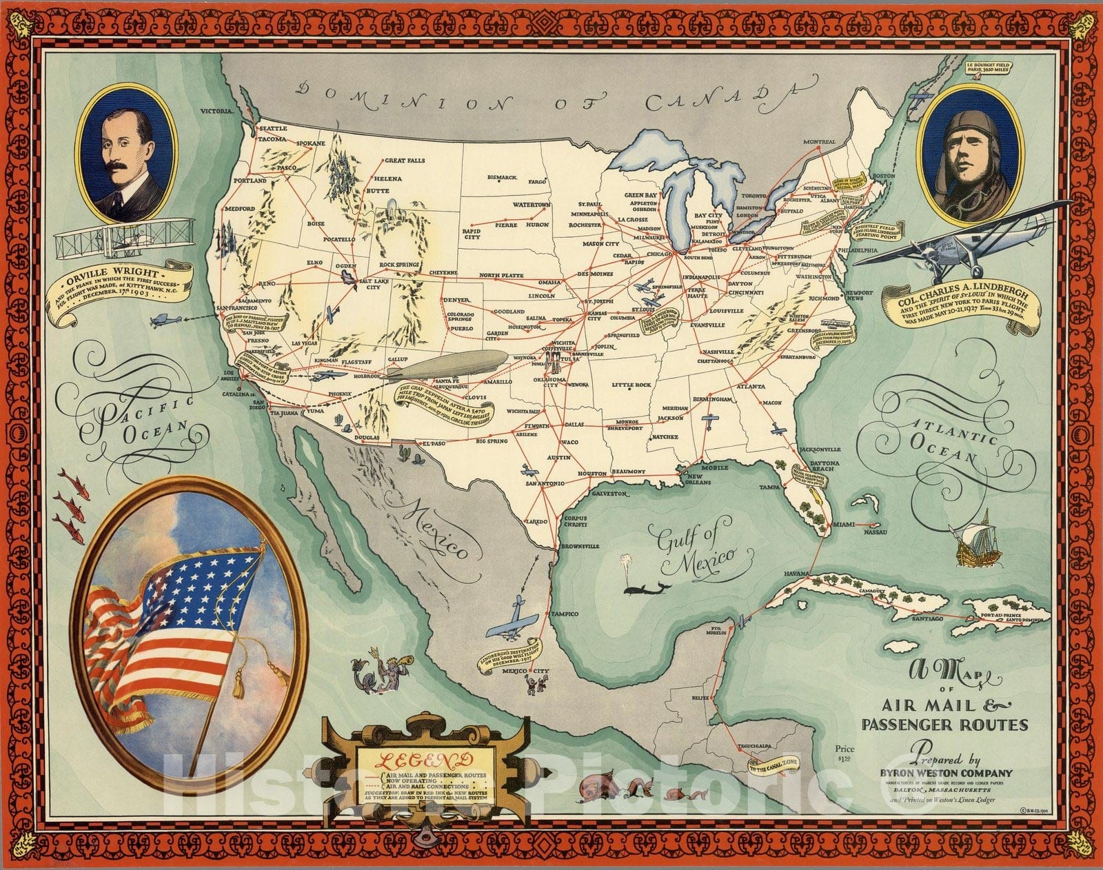 A Map of Air Mail & Passenger Routes. Prepared by Byron Weston Company, Manufacturers of Highest Grade Record and Ledger Papers. Dalton, Massachusetts and Printed on Weston's Linen Ledger. (c) B.W. Co. 1930. | A Map of Air Mail & Passenger Routes. Prepared by Byron Weston Company, Manufacturers of Highest Grade Record and Ledger Papers. Dalton, Massachusetts and Printed on Weston's Linen Ledger. (c) B.W. Co. 1930. | Mounted on linen.