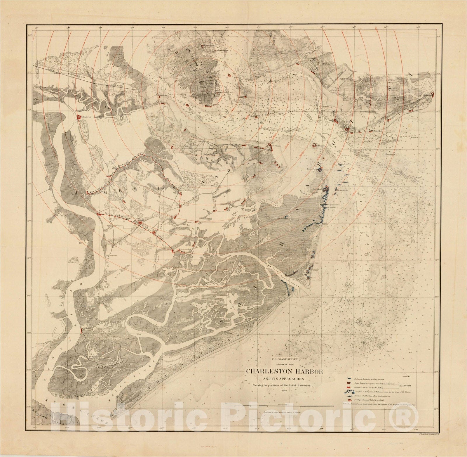 Charleston Harbor And Its Approaches Showing the positions of the Rebel Batteries 1863., 1863, United States Coast Survey, v3, Vintage Wall Art :