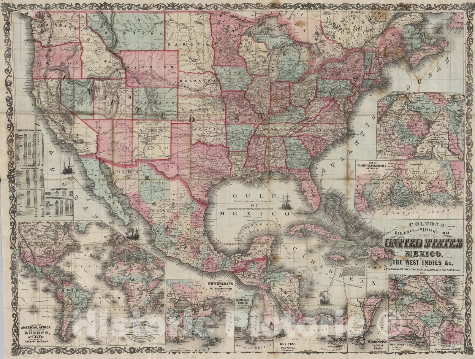 • Historic Map : Colton's Railroad And Military Map Of The United States., 1865, Vintage Wall Art
