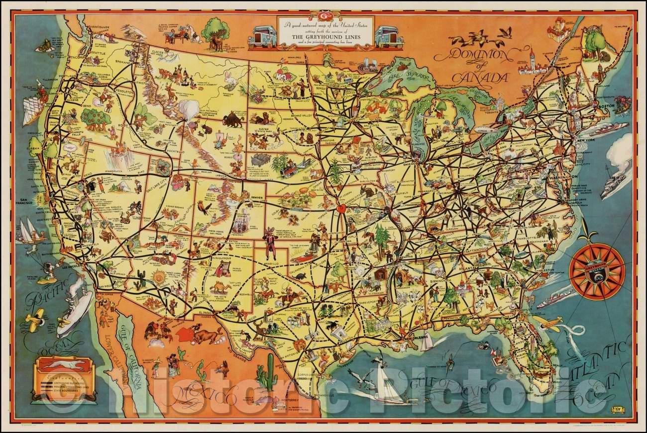 Historic Map - A good-natured map of the United States setting forth the service of The Greyhound Lines and a few principal connected but lines, 1937, - Vintage Wall Art