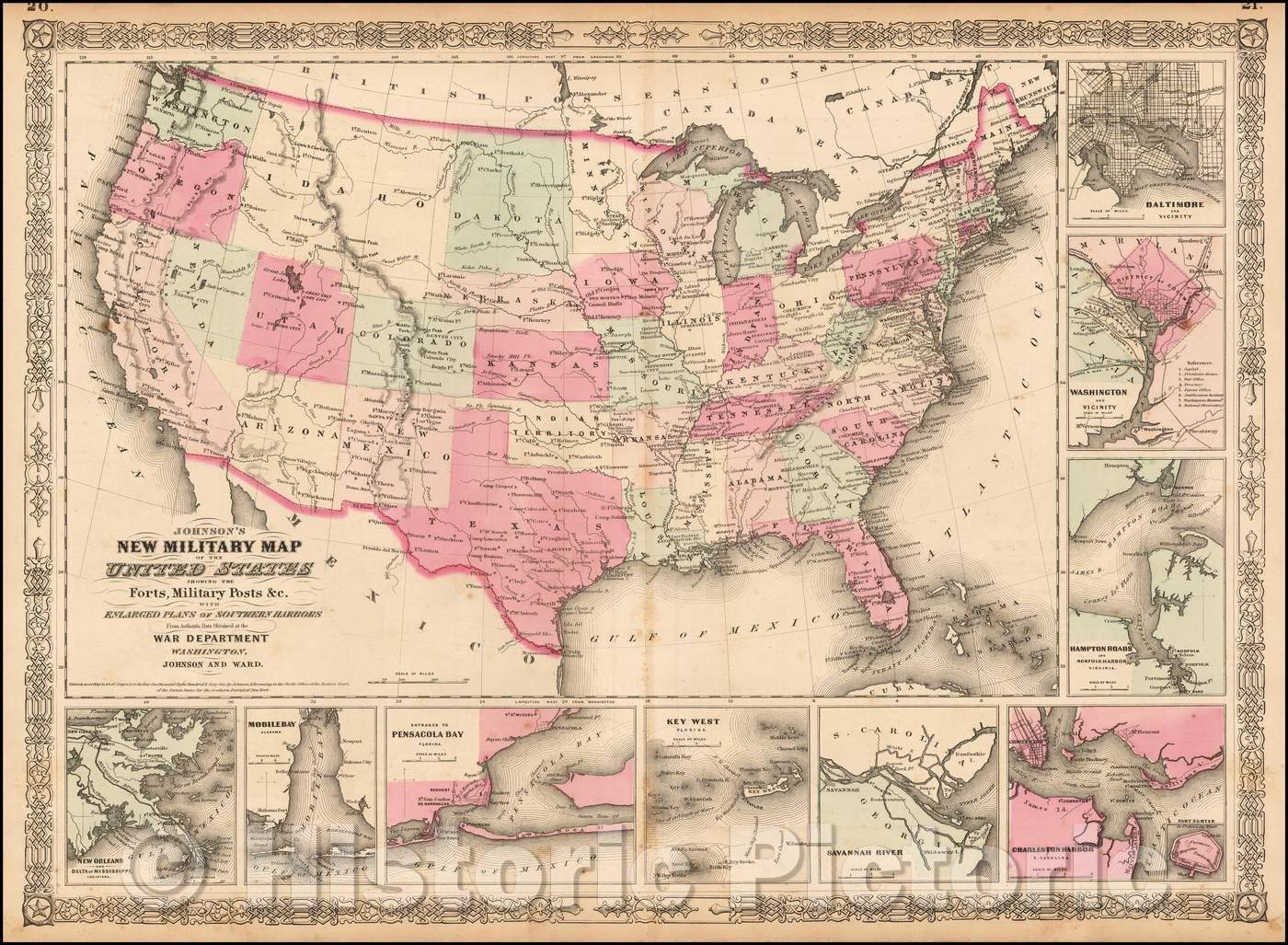 Historic Map - Johnson's New Military Map of the United States Forts, Military Posts with Enlarged Plans of the Southern Harbors, 1862, Benjamin Ward v2