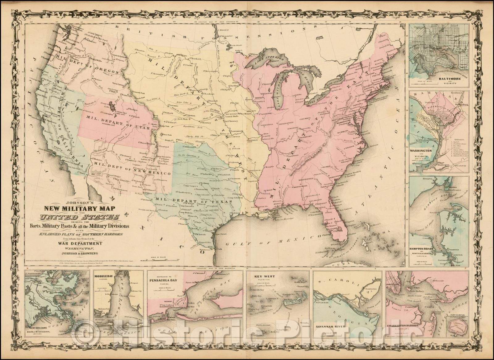 Historic Map - Johnson's New Military of the United States Forts, Military Posts & all the Military Divisions with Enlarged Plans of the Southern Harbors, 1861 v1