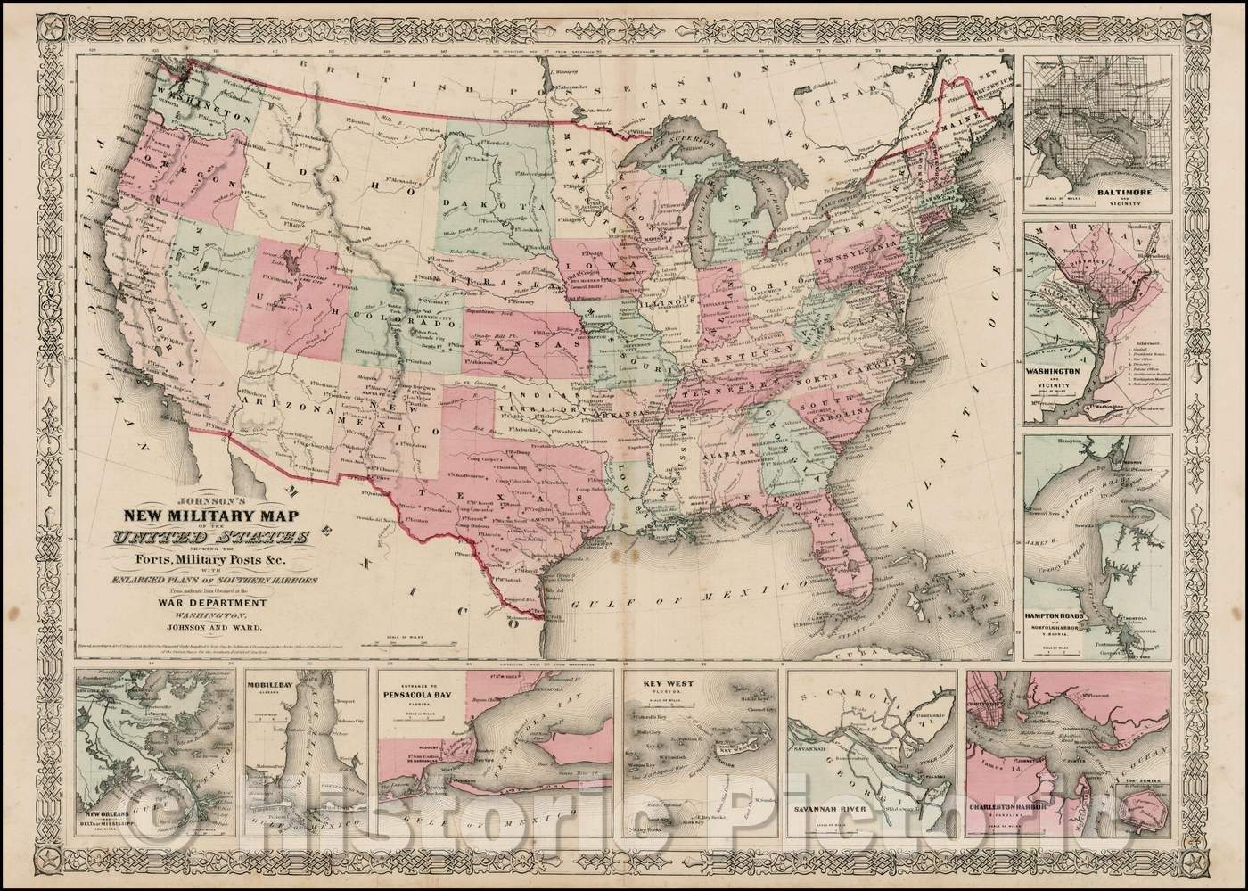 Johnson's New Military of the United States Forts, Military Posts & all the Military Divisons with Enlarged Plans of the Southern Harbors, 1864