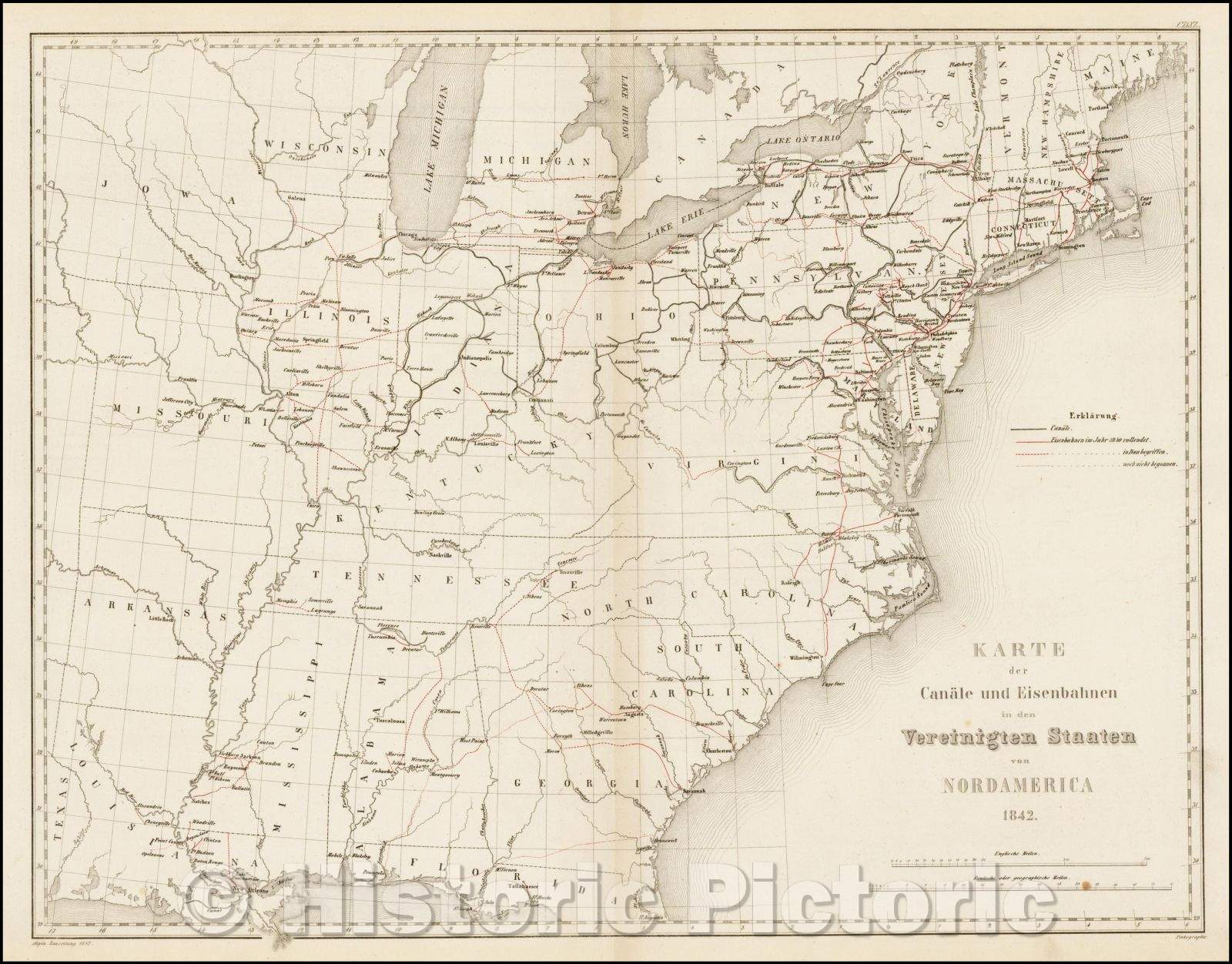 • .Historic Map - Karte der Canale und Eisenbahnen in den Vereinigten Staaten/Map of the United States, Canals and Train Routes in the United States, 1842 - Vintage Wall Art