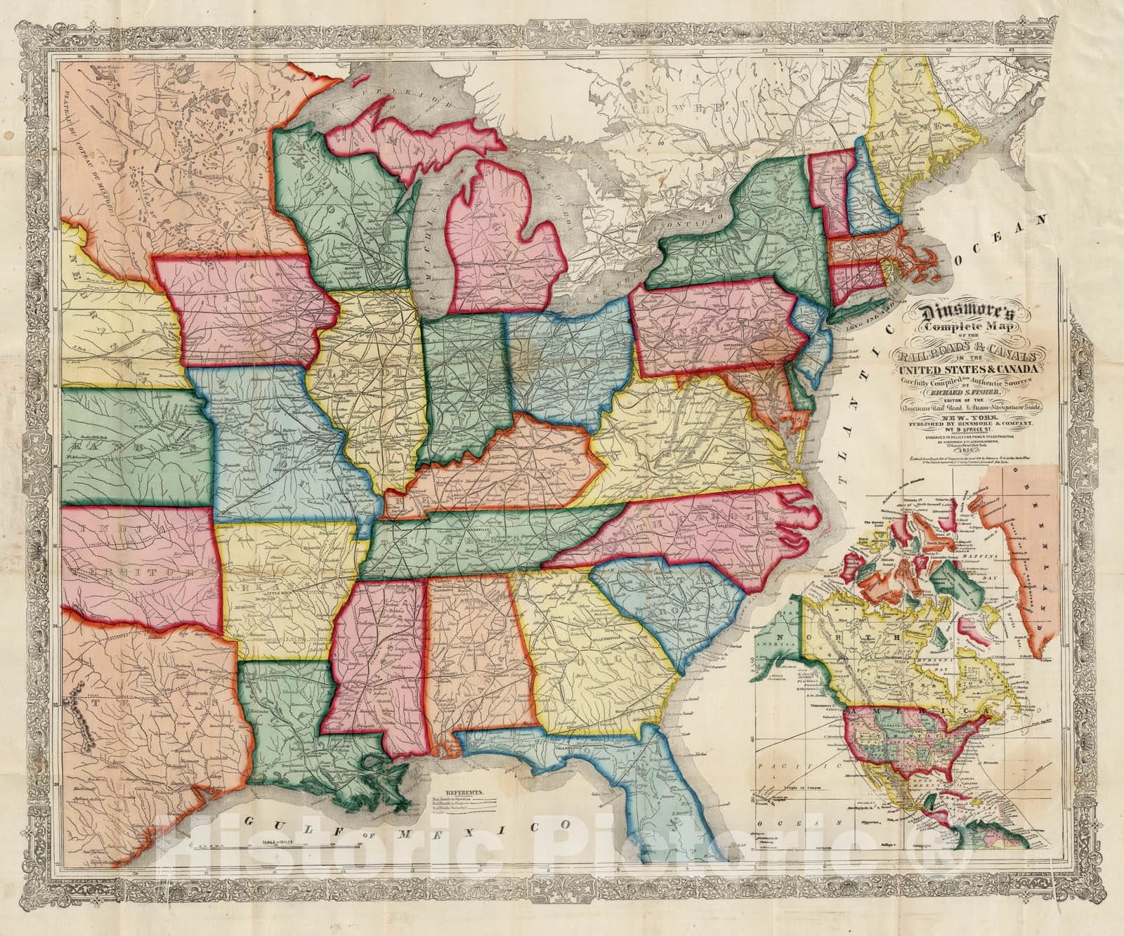 Dinsmore's Complete Map Of The Railroads & Canals In The United States & Canada Carefully Compiled from Authentic Sources by Richard S. Fisher, Editor Of The American Rail Road & Steam Navigator Guide. New-York. Published By Dinsmore & Company, No. 9 Spruce St. Engraved In Relief For Power Press Printing by Schonberg & Co. Acrographers, 75 Nassau Street New York 1856. Entered ... 1856 by Dinsmore & Co. ... New York. | Dinsmore's Complete Map Of The Railroads & Canals In The United States & Canada Carefully Compiled from Authentic Sources by Richard S. Fisher, Editor Of The American Rail Road & Steam Navigator Guide. New-York. Published By Dinsmore & Company, No. 9 Spruce St. Engraved In Relief For Power Press Printing by Schonberg & Co. Acrographers, 75 Nassau Street New York 1856. Entered ... 1856 by Dinsmore & Co. ... New York. | See note field above.