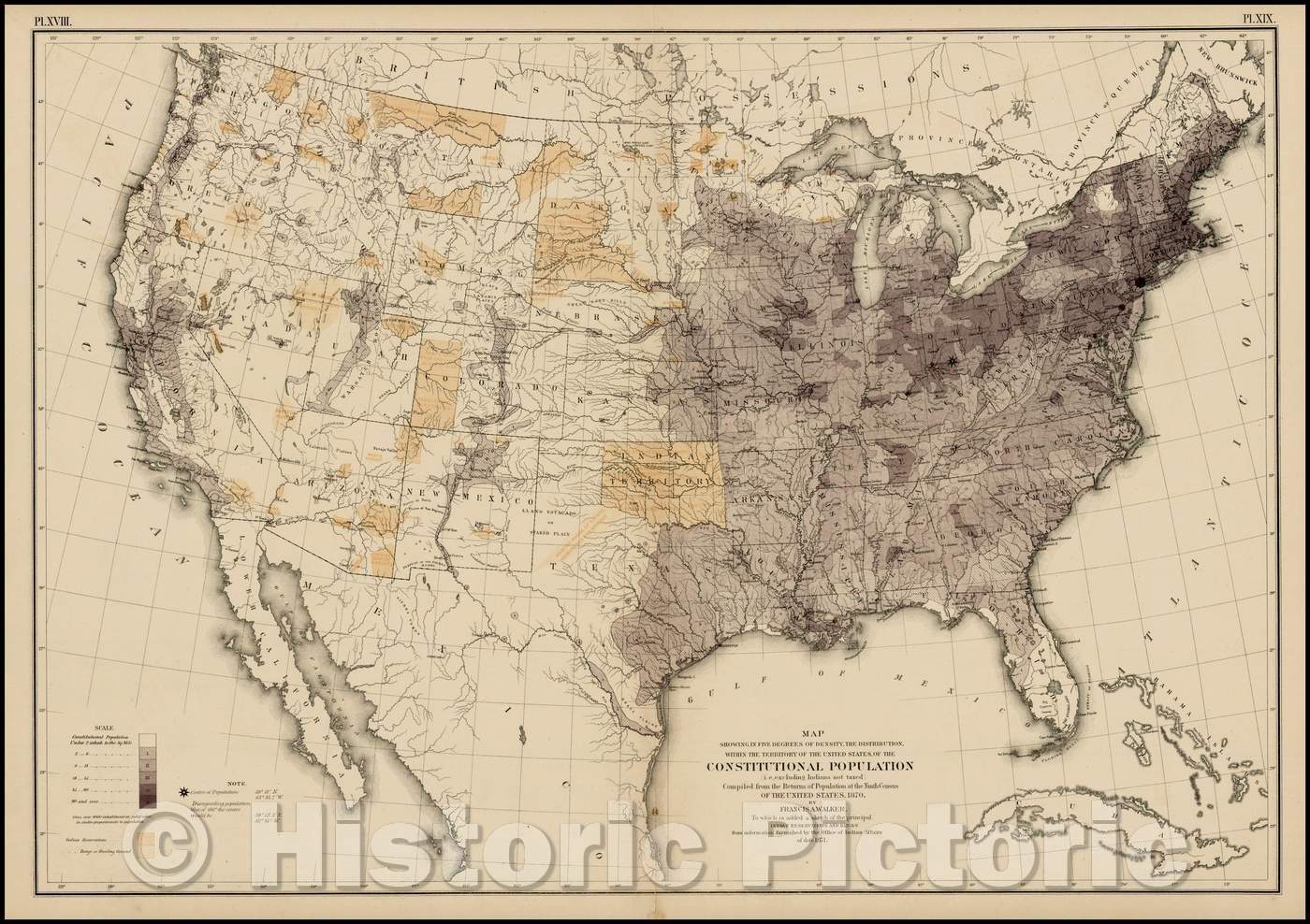 Historic Map - Map Showing In Five Degrees of Density, Distribution, Within The Territory of United States of the Contitutional Population, ie, 1871 - Vintage Wall Art