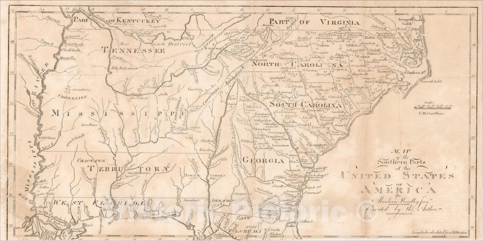 • .Historic Map : Map of the Southern Parts of the United States of America By Abraham Bradley Junr., 1804, Jedidiah Morse, Vintage Wall Art