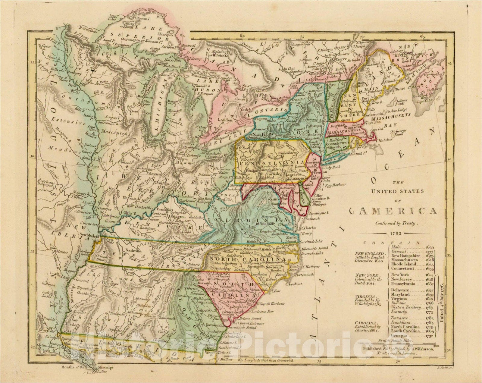 Historic Map : The United States of America Confirmed By Treaty 1783 [shows Franklinia], 1806, Robert Wilkinson, v3, Vintage Wall Art
