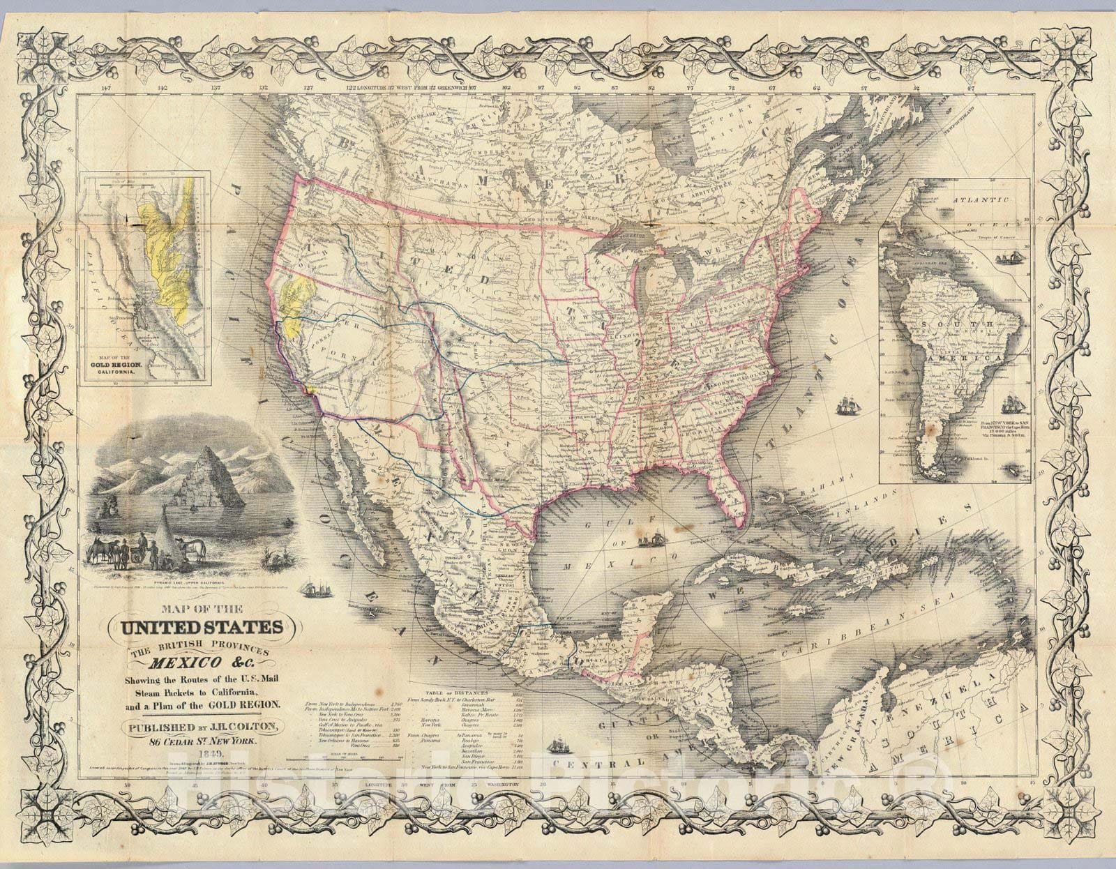 Map Of The United States The British Provinces Mexico &c. Showing the Routes of the U.S. Mail Steam Packets to California, & A Plan of the Gold Region. Published By J.H. Colton, 86 Cedar St. New York. 1849. Drawn & Engraved by J.M. Atwood. New York. Entered ... 1849 by J.H. Colton ... New York. (inset) Map Of The Gold Region. California. (untitled inset of South America). | Map Of The United States The British Provinces Mexico &c. Showing the Routes of the U.S. Mail Steam Packets to California, & A Plan of the Gold Region. Published By J.H. Colton, 86 Cedar St. New York. 1849. Drawn & Engraved by J.M. Atwood. New York. Entered ... 1849 by J.H. Colton ... New York. (inset) Map Of The Gold Region. California. (untitled inset of South America). | See note field above.
