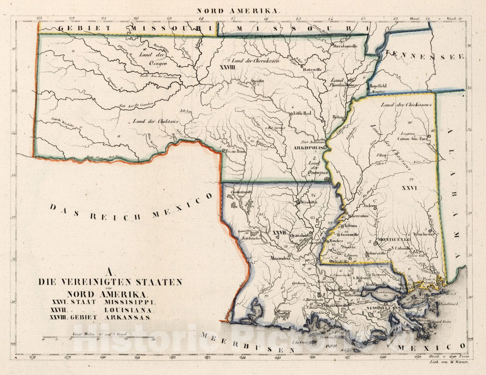 A. Die Vereinigten Staaten von Nord Amerika. Lith. v. W. Werner. (to accompany) Atlas von Amerika in 30 Charten und einem erlauterndem Texte. | Atlas von Amerika in 30 Charten und einem erlauterndem Texte. Entworfen von W. E. A. von Schlieben ; die Charten lithographirt, Werner. Leipzig, bei George Joachim Goschen, 1830. | Atlas of America, with 54 pages of text, index, abbreviations,and outline hand color maps, some folded. Includes Index. Bound in beige cardboard covers with decorative border, 35x26.5, title " W. E. A. von Schlieben, Atlas von Amerika. Leipzig, bei George Joachim Goschen".
