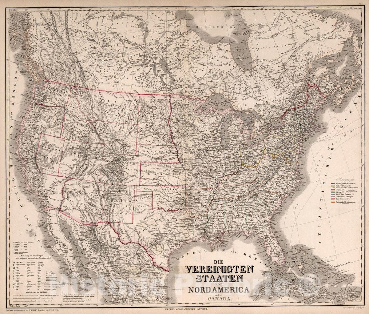 Die Vereinigten Staaten von Nord America nebst Canada. Bearbeitet and gezeichnet von H. Kiepert. Revidirt von C. Graf 1865. Gestochen von C. Poppey jun. Weimar: Geographisches Institut. (to accompany) Hand - Atlas Der Erde Und Des Himmels. | Hand - Atlas Der Erde Und Des Himmels. In siebzig Blattern. Zweiundvierzigste Auflage. Bearbeitet Von Dr. H. Kiepert, C. Graf, A. Graf Und Dr. C. Bruhns. Weimar, Geographisches Institut. | Publisher:Weimer Geographisches Institut