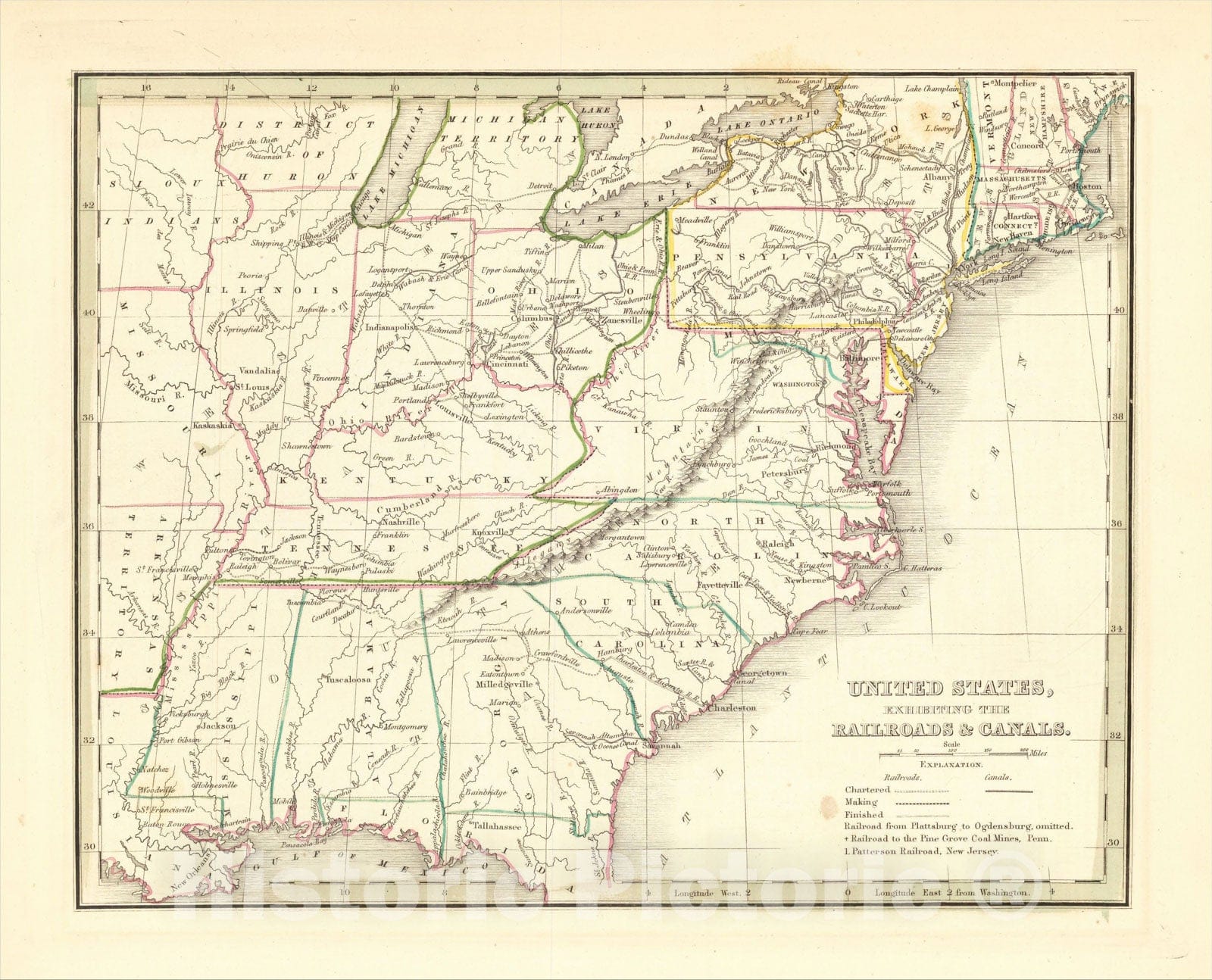 Historic Map : United States, Exhibiting the Railroads and Canals, 1835, Thomas Gamaliel Bradford, Vintage Wall Art