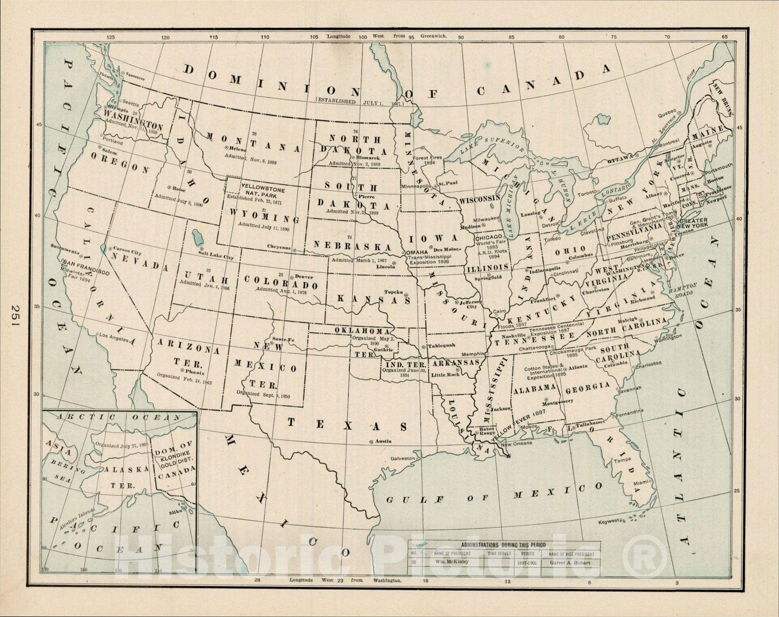Historic Map : A Map of the United States (no title) . . .1897 - 191, 1901, George F. Cram, Vintage Wall Art