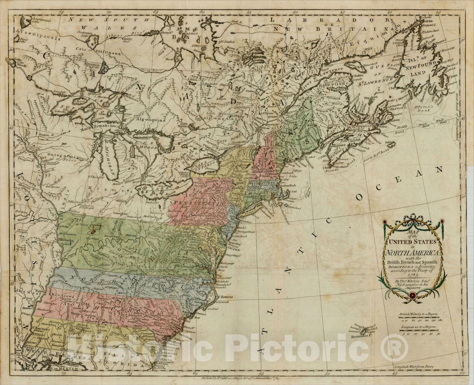 Historic Map : Map of the United States in North America: with the British, French and Spanish Dominions adjoining, according to the Treaty of 1783., 1783, v2, Vintage Wall Art