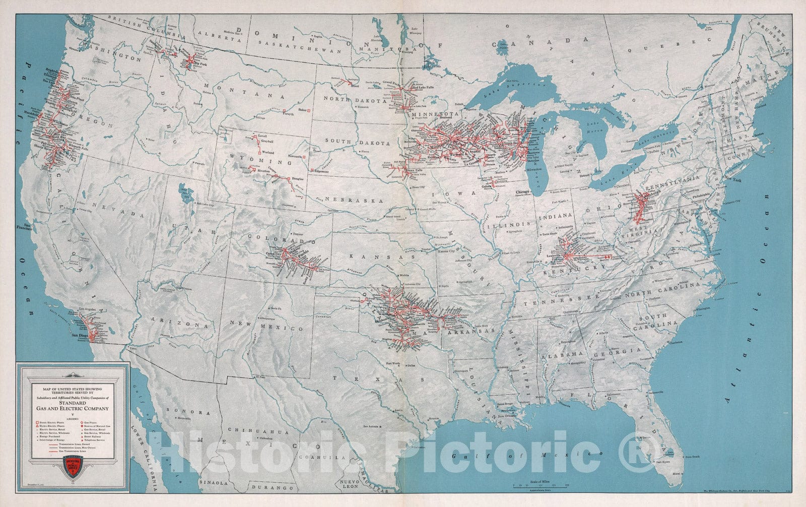 Historic Map : Map of the United States showing territories served by subsidiary and affiliated Public Utility Companies, 1929, Vintage Wall Art