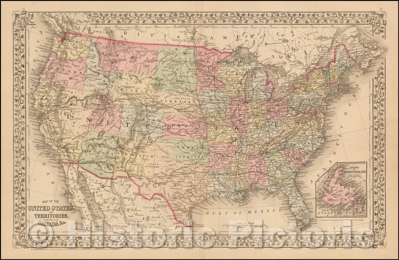 • .Historic Map - Map of the United States And Territories, Together with Canada, 1878, Samuel Augustus Mitchell Jr. v3