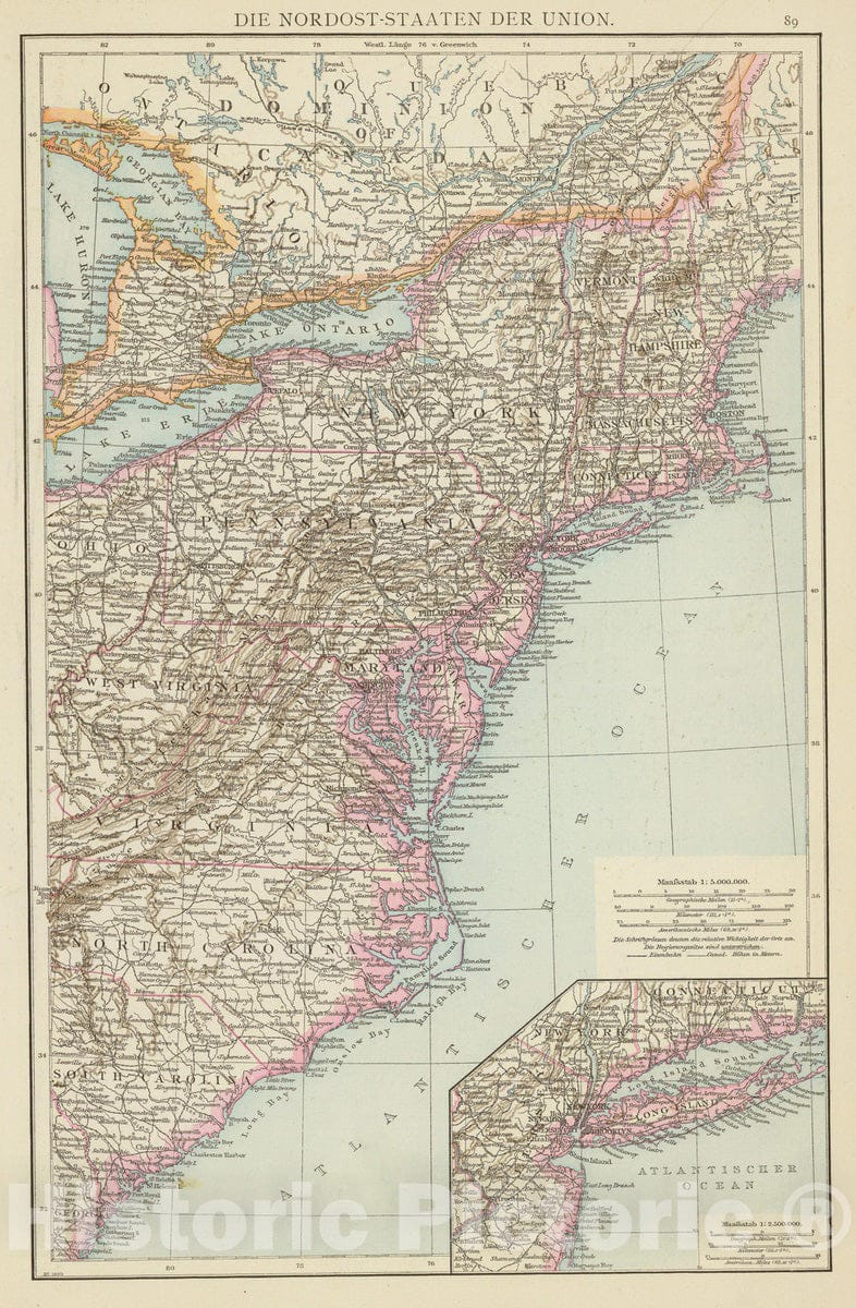 Historic Map : United States, U.S. North East, 1881 Nordost-Staaten der Union. , Vintage Wall Art