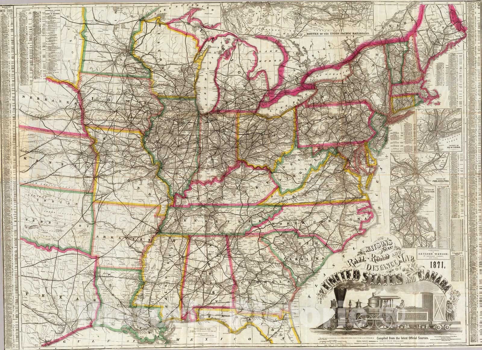 Historic Map : Watson's new rail-road and distance map of the United States and Canada, 1871 - Vintage Wall Art
