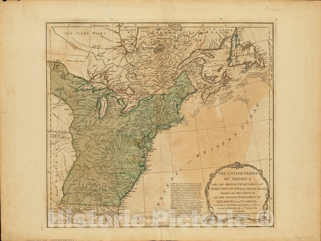 The United States of America with the British possessions of Canada, Nova Scotia, & of Newfoundland, divided with the French : and the Spanish territories of Louisiana and Florida according to the preliminary articles of peace signed at Versailles the 20th of Jany. 1783